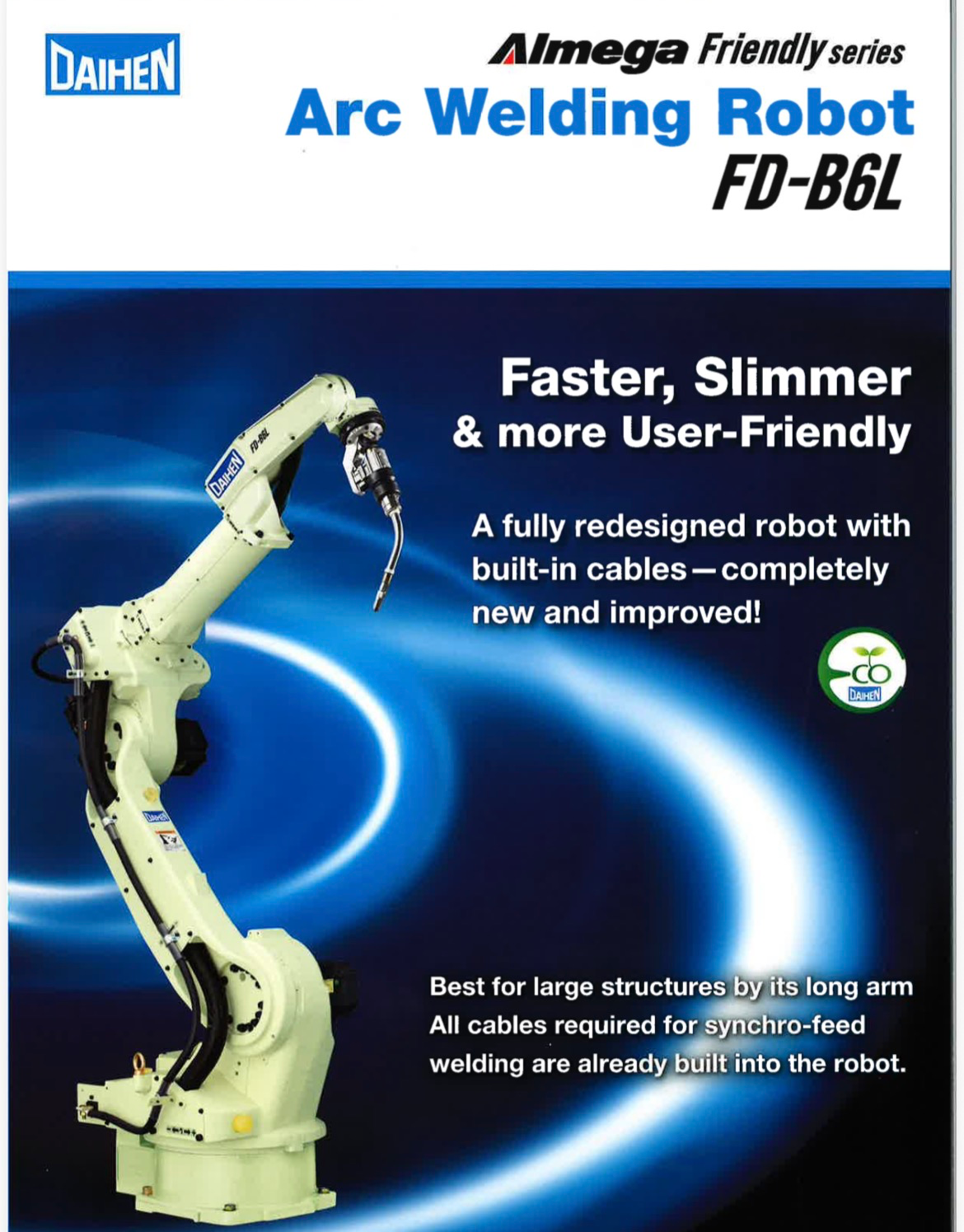 Nirmal Trading Corporation is proud to offer the DAIHEN FD-B6L, a fully redesigned arc welding robot from the Almega Friendly series. Known for being faster, slimmer, and more user-friendly, the FD-B6L is the industry standard for high-speed, high-precision welding of large structures.